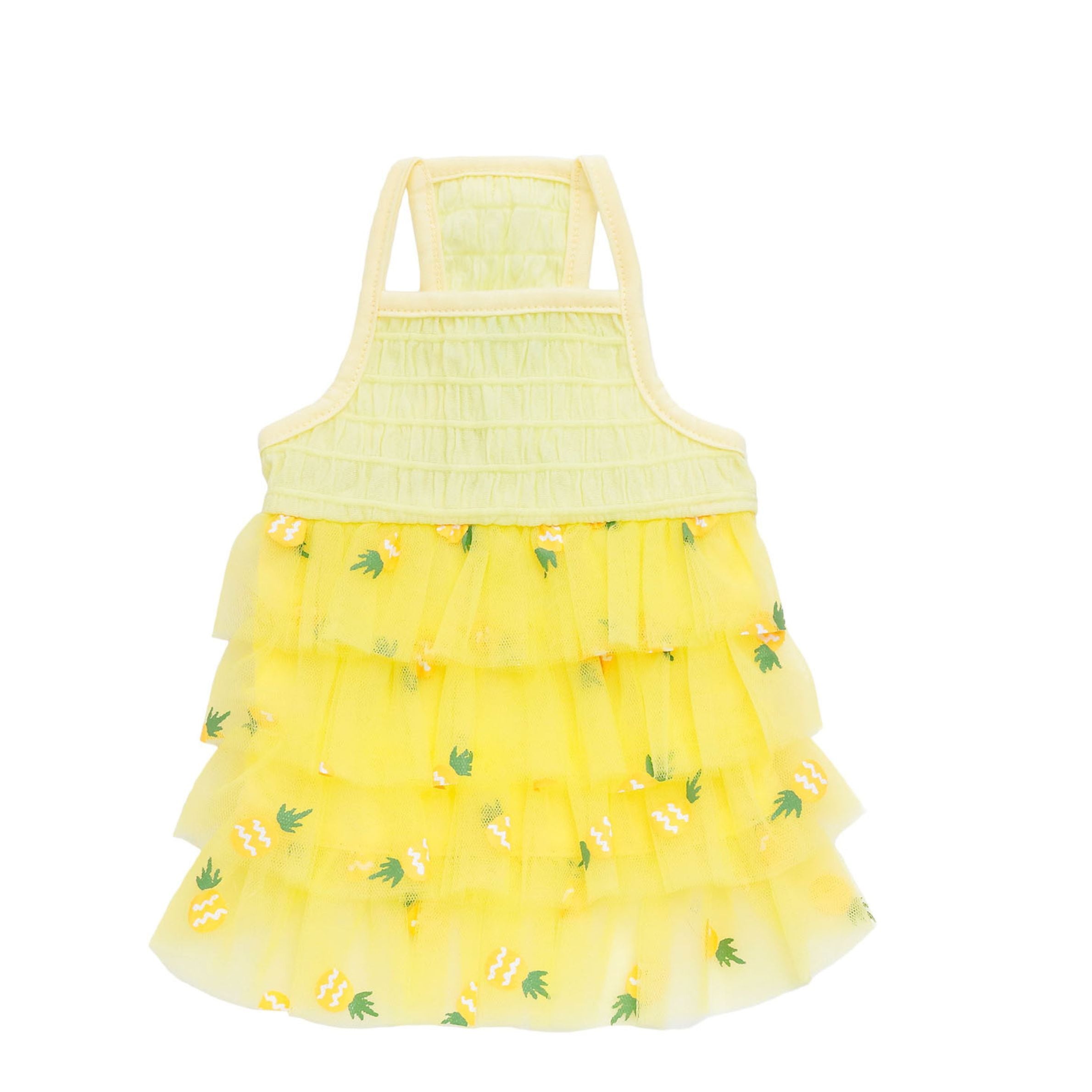トップスは柔らかい生地にシャーリングを効かせて、ふんわり伸縮で優しく体にフィット。スカートは透け感のある涼しげなチュール素材で、形と色が綺麗に出るように裏地をつけました。着心地良く、軽やかだけど着崩れしないから元気なワンちゃんも安心です。